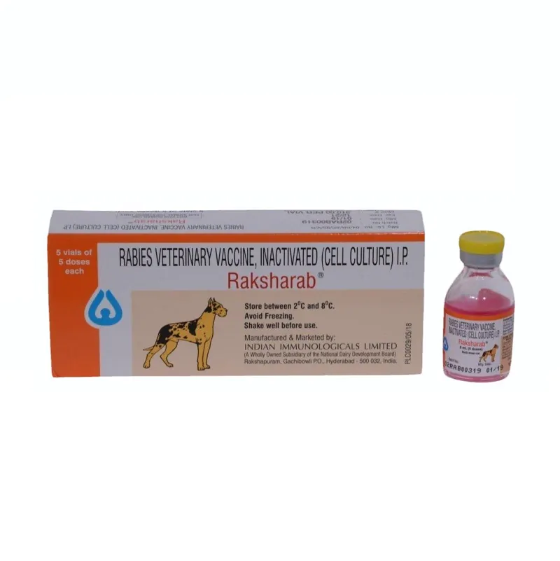 Raksharab is recommended for immunization of dogs and other domestic animals against rabies for prophylactic use. Raksharab Vaccine contains inactivated rabies virus with a potency > 1.0 I.U. per dose. The virus is propagated in BHK-21 Cell line, inactivated with an aziridine compound and concentrated.