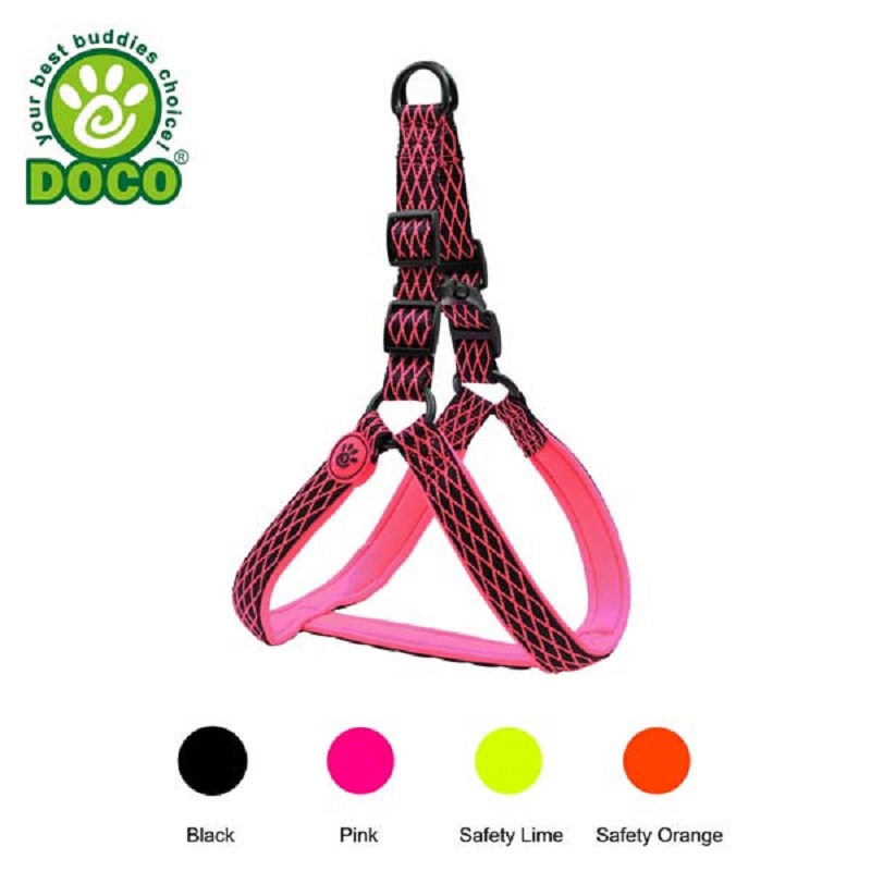 DOCO® Dual Layer Air Mesh Reflective Step-in Harness features breathable and durable high quality air mesh. This harness provides a comfort fit, total control and style between your chest. Ultra comfort, lightweight design and dual layered for higher tensile strength. Easy on and easy off, durable side release plastic buckle with adjustable tri-glide for custom fits. Heavy-duty stitching for lasting quality and fully welded metal D/O-Rings for higher tensile force. Solid and vibrant colors are easy to see. Piping has reflective stitching to ensure your buddy is safe and seen at all times. Make sure to select the matching DOCO® leashes to complete your buddies look! Air Mesh is breathable and light weight, keep your pet cool and ventilated and super soft and comfortable on Dog’s skin and fur. All of DOCO® harnesses are designed to reduce stress, allowing weight to be distributed evenly through the chest and shoulders when your buddy during walks. * Match with DOCO® Mesh Leash: DCA1348 Special features Hi-Density quality air mesh fabric Breathable and SUPER LIGHT WEIGHT Dual Layered mesh for higher tensile strength Reflective piping thread stitch throughout the collar for the nighttime safety Heavy duty D-Ring for leash and ID tag Durable plastic buckle on the top for easy on and easy off Tri-glide for easy size adjustment Vibrant colors are easy to see at all times! Size Chart S 5/8×11-16″ M 5/8×15-20″ L 3/4×19-24″ XL 1×23-27.5″