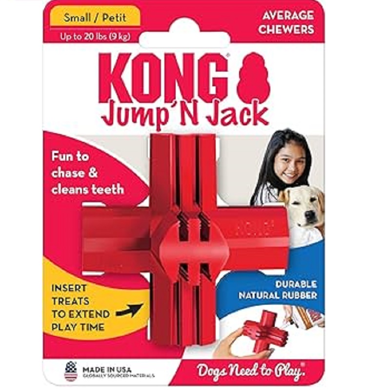 The KONG Jump’N Jack has a fun bounce and unique design that’s great for chew sessions. The ridges reduce plaque while providing a gentle cleaning and conditioning of teeth and gums. Fill the ridges with  Easy Treat or Peanut Butter to extend playtime and satisfy chewing instincts.