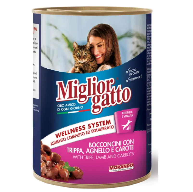 Meat and animal derivatives 30% (tripe 5%, lamb 5%), dehydrated carrots 4%, cereals, minerals.