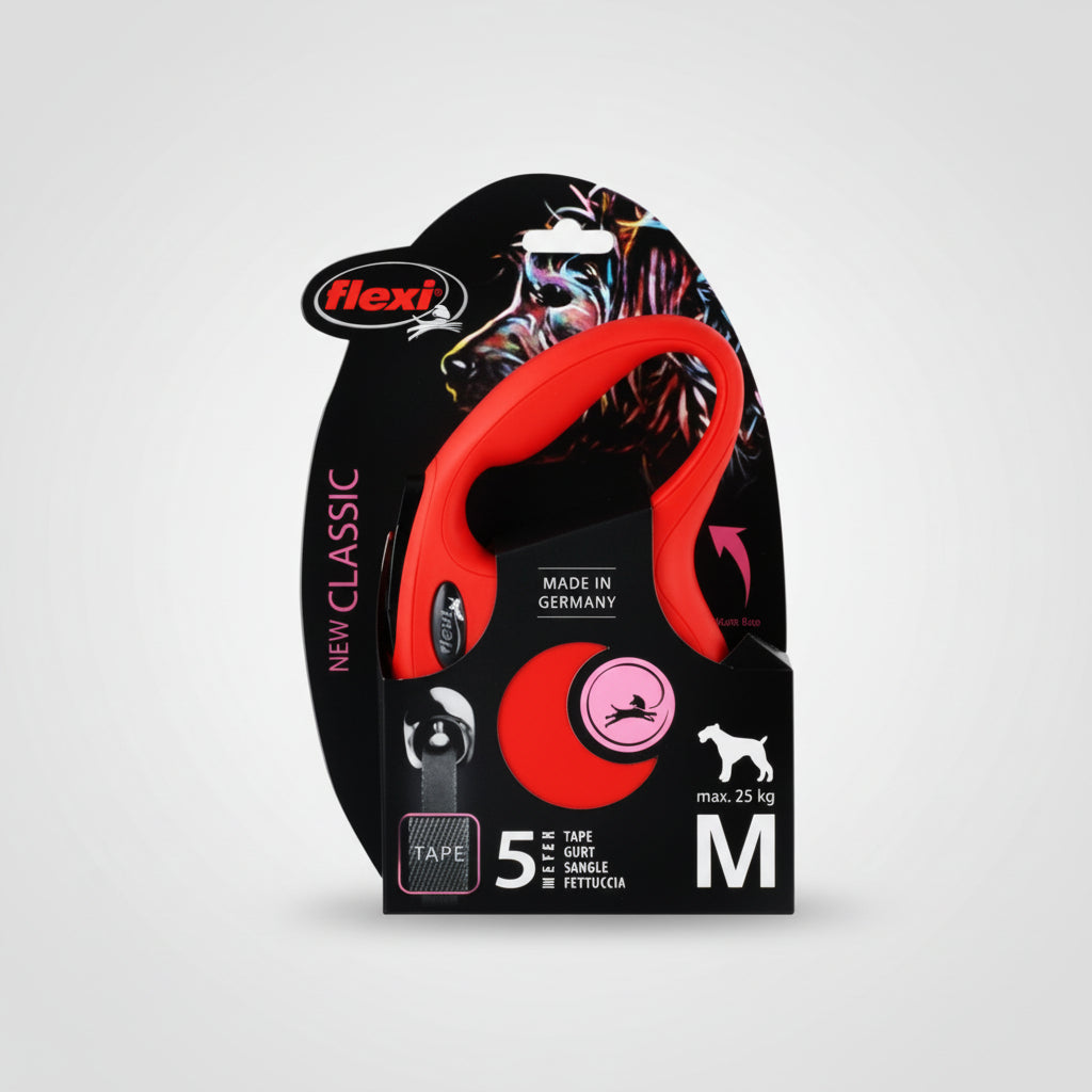 The Flexi New Classic Tape is a retractable leash designed to give your dog controlled freedom during walks . This specific model is the Medium (M) size with a 5-meter long tape, finished in red.